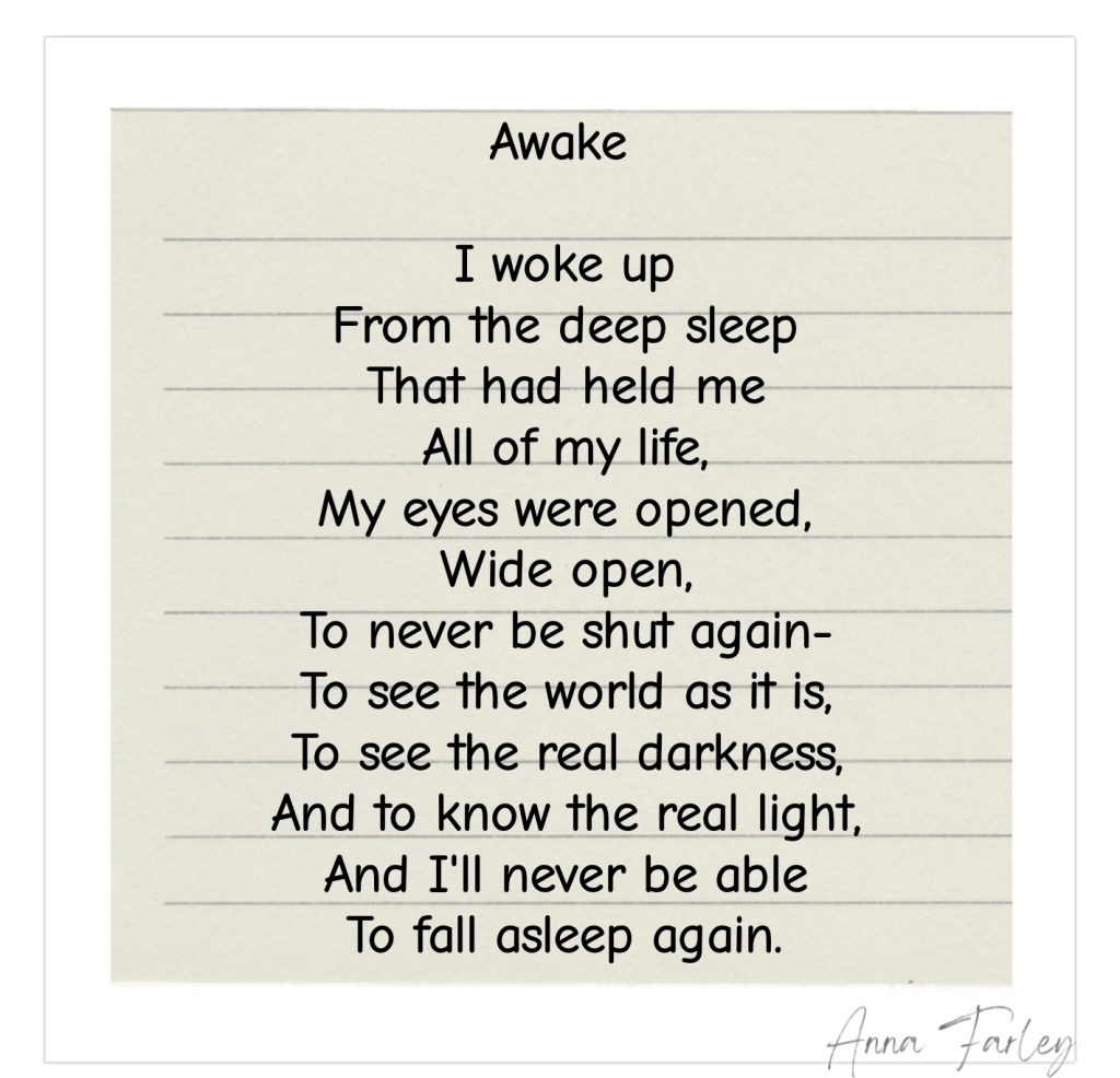 Poem: Awake Posted byannamfarleyApril 14, 2022Posted inUncategorizedTags:Aging, book, Courage, Current Events, Empowerment, Freedom, Inspiration, Liberty, Passion, Poem, poetry, writer, Writing Sharing today a poem that requires no explanation but I know so many people are starting to feel it. Share this: Click to share on X (Opens in new window) X Click to share on Facebook (Opens in new window) Facebook Like Loading... Related