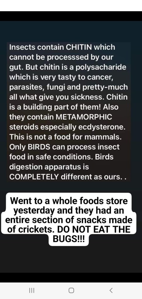 Wanted to share the below information which I shared on my social media. Was in a local food coop/whole food grocery store yesterday and they had an advertised section for crickets. They are working hard to convince people to eat this. Don’t do it.